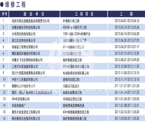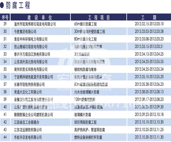 宏順建設(shè)工程有限公司是國家批準(zhǔn)成立的專業(yè)高空作業(yè)企業(yè):承攬過(國內(nèi).國外)煙囪新建、煙囪防腐、吊機防腐、水塔防腐、管道防腐、龍門吊防腐、儲存罐防腐、煙囪內(nèi)壁防腐等高空作業(yè)工程。具有“不搭腳手架 、 不需要停產(chǎn)”施工特點。